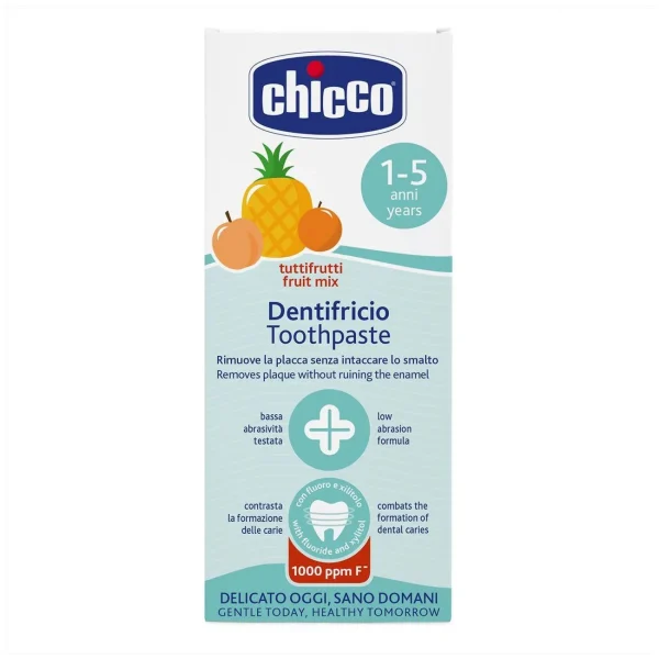 خمیر دندان کودک چیکو Chicco با طعم میوه‌ای خوشمزه آناناس، هلو و پرتقال، در حجم ۵۰ میل، ویژه کودکان ۱ تا ۵ سال. فاقد فلوراید، شکر، الکل و رنگ مصنوعی. این محصول با ترکیبات طبیعی و حاوی کلسیم، به محافظت از مینای دندان و جلوگیری از پوسیدگی کمک می‌کند. ساخت کشور ایتالیا.