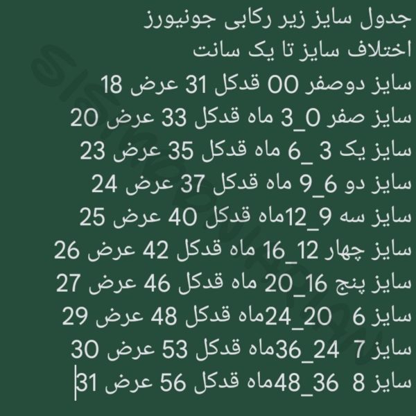سایز دوصفر, سایز صفر 0_3ماه, سایز یک 3_6ماه, سایز دو 6_9ماه, سایز سه 9_12ماه, سایز چهار 12_16 ماه, سایز پنج 16_20ماه, سایز شش 20_24ماه, سایز هفت 24_36ماه, سایز هشت 36_48ماه |