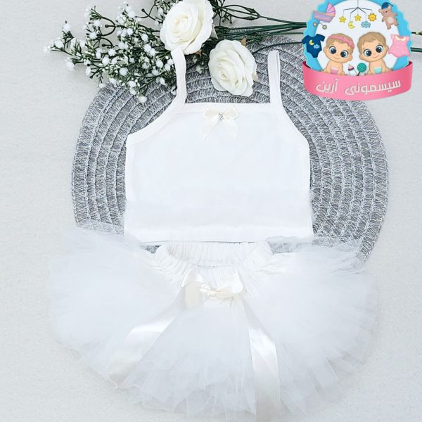 ست جذاب و خاص دخترانه شامل تاپ سفید و دامن پفی چندلایه با پاپیون صورتی. مناسب نوزاد تا ۳ سال. انتخابی ایده‌آل برای تولد، عکاسی و مهمانی‌ها
