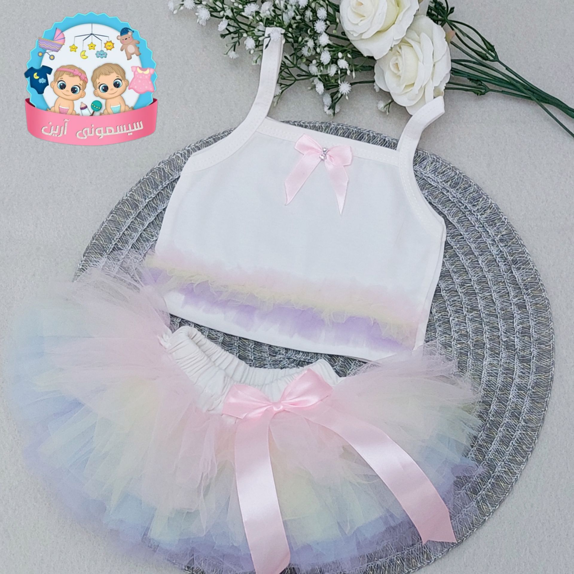 تاپ سفید با پاپیون صورتی و تزئین تورهای رنگی پایین‌تاپ، به همراه دامن چندلایه پفی از تور نرم در رنگ‌های پاستلی (صورتی، یاسی، آبی، زرد) و پاپیون بزرگ، ظاهری فرشته‌وار و بسیار خاص به کوچولوی شما می‌بخشه.