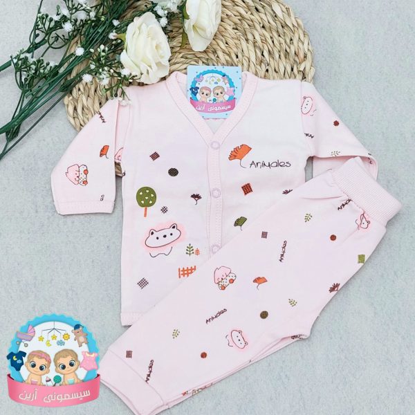 ست دوتیکه جلودکمه شلوار جونیورز صورتی سایز نوزاد زودرس دوصفر طرح شیر